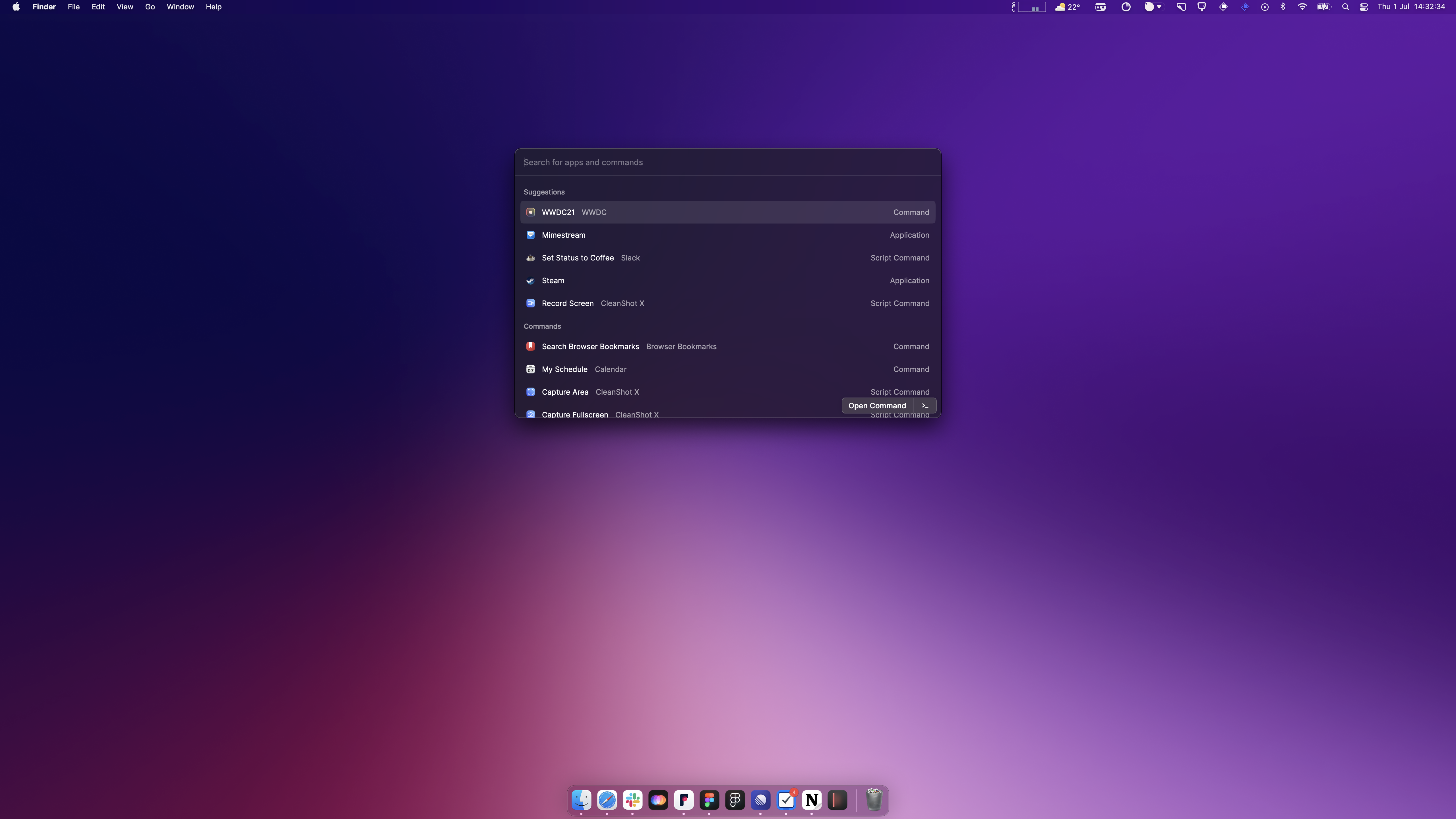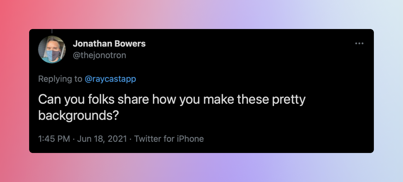 At Raycast, Designers will create new designs in Figma, and put together a series of screens for the flow they're working on. Behind the app interface, a gradient color will be applied to give the impression of the real thing, and the app being used in context.