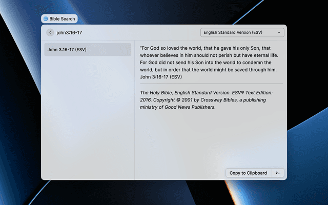 Search for, display, copy and paste bible passages. Configure whether to include verse numbers or show one verse per line.