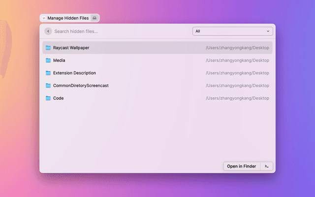 - 🌟🌟🌟But you can always use the shortcut " ⇧+⌘+. " or Raycast build-in Toggle Hidden Files command to see all system hidden files.